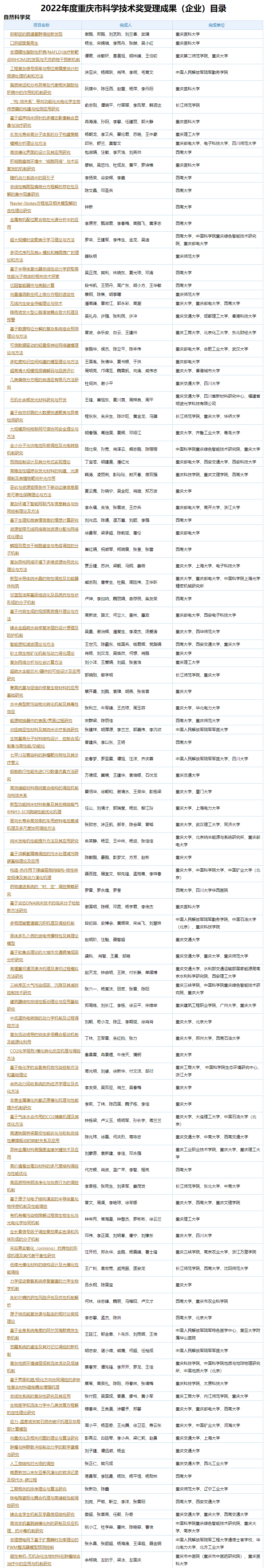 近日,2022年度重慶市科學技術獎提名工作已結束,重慶市科學技術獎勵工作辦公室共受理有關單位和專家提名的重慶市科學技術獎成果(企業)575項,現進行公示,其中自然科學獎104項、技術發明獎24項、科技進步獎434項、企業技術創新獎13項。