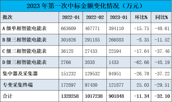 從中標(biāo)金額的同比和環(huán)比數(shù)據(jù)來(lái)看,僅專變采集終端(含能源控制器專變)分標(biāo)招標(biāo)金額環(huán)比實(shí)現(xiàn)增長(zhǎng),D級(jí)三相智能電能表分標(biāo)、A級(jí)三相智能電能表分標(biāo)、C級(jí)三相智能電能表和集中器采集器分標(biāo)同比降幅明顯。