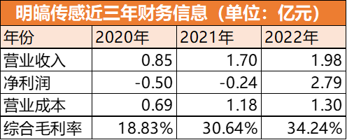 據了解,明皜傳感主要從事MEMS傳感器研發、設計和銷售的芯片設計。其招股書顯示2020年、2021年及2022年財務信息如下(注:訂正2022年凈利潤為0.28):