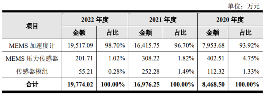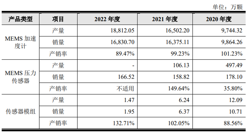 按以上各產品營收來看,目前占比最大的是MEMS加速度計,占比98.70%。同樣,該產品的產銷量也最高。