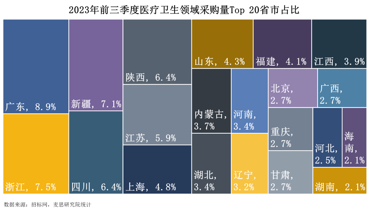 2023年前三季度,廣東、浙江、新疆、四川、陜西為醫(yī)療衛(wèi)生域質(zhì)譜儀器采購量的Top 5省份,中標數(shù)量占比合計36.3%。