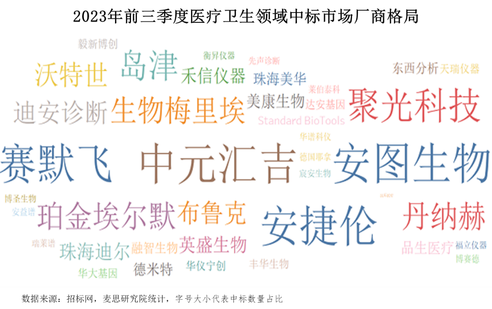 醫(yī)療衛(wèi)生領域中標數(shù)量Top 5企業(yè)分別為中元匯吉、安圖生物、安捷倫、賽默飛、聚光科技。相較于其他領域,國內(nèi)廠商在醫(yī)療衛(wèi)生領域表現(xiàn)優(yōu)異。