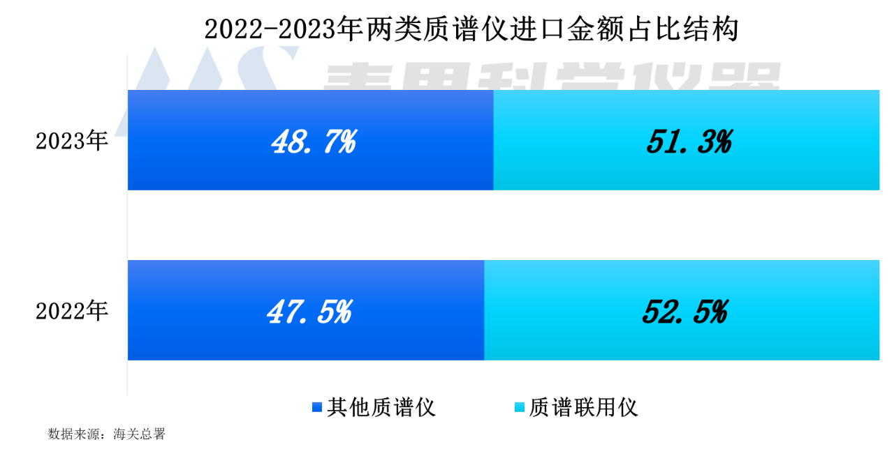 2023年質譜聯用儀的進口金額占比達51.3%,與上年相比減少1.2個百分點;其他質譜儀的占比為48.7%。從兩類質譜儀的金額占比結構看,質譜聯用儀的進口需求更旺盛,但兩類質譜儀的份額差距在縮小。