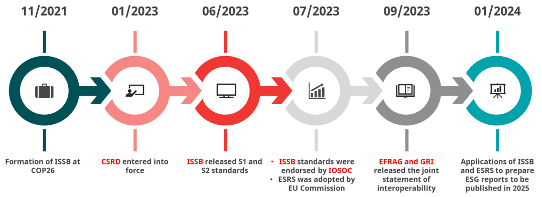 * 2023年7月,國際證監(jiān)會組織(IOSCO)發(fā)布聲明認(rèn)可ISSB標(biāo)準(zhǔn),意味著很多國家的證券交易所將采用ISSB標(biāo)準(zhǔn)。