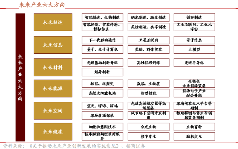 ●未來產(chǎn)業(yè):1月29日,7部門聯(lián)合發(fā)布《關(guān)于推動(dòng)未來產(chǎn)業(yè)創(chuàng)新發(fā)展的實(shí)施意見》,其中提出“要重點(diǎn)推進(jìn)未來制造、未來信息、未來材料、未來能源、未來空間和未來健康六大方向產(chǎn)業(yè)發(fā)展。”