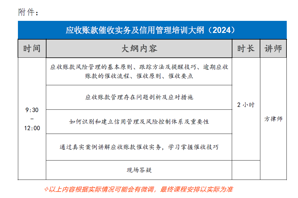附件:應(yīng)收賬款催收實(shí)務(wù)及信用管理培訓(xùn)大綱(2024
