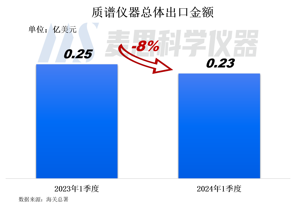 2024年1季度我國(guó)質(zhì)譜儀器出口金額為2300萬(wàn)美元(約合人民幣1.64億元),同比下降8%。