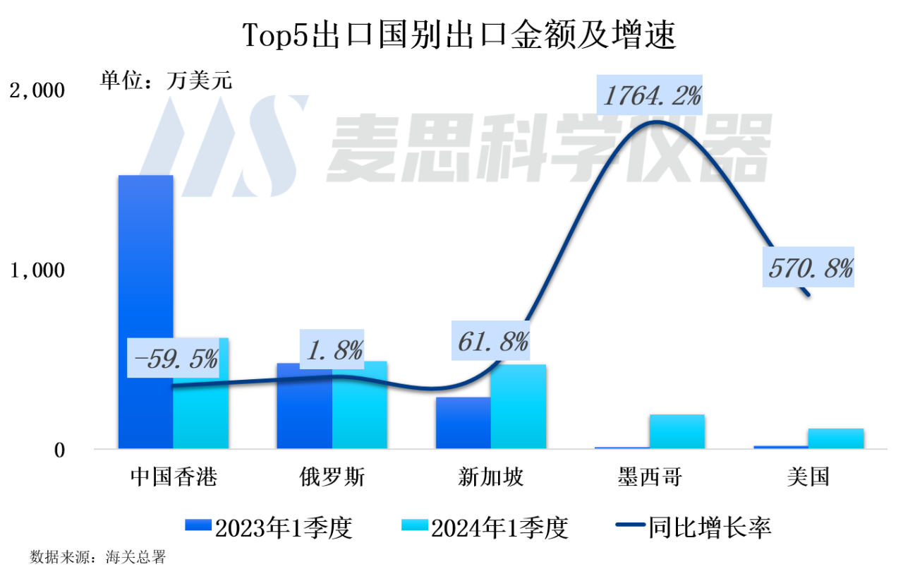 中國(guó)質(zhì)譜儀器的出口主要集中在“其他質(zhì)譜儀器”類別,2024年1季度出口額為1800萬(wàn)美元,同比下降了25%。與此同時(shí),質(zhì)譜聯(lián)用儀的出口額約為500萬(wàn)美元,與去年同期相比增長(zhǎng)了84%,盡管增速顯著,但由于其基數(shù)較小,實(shí)際增長(zhǎng)額僅為240萬(wàn)美元。