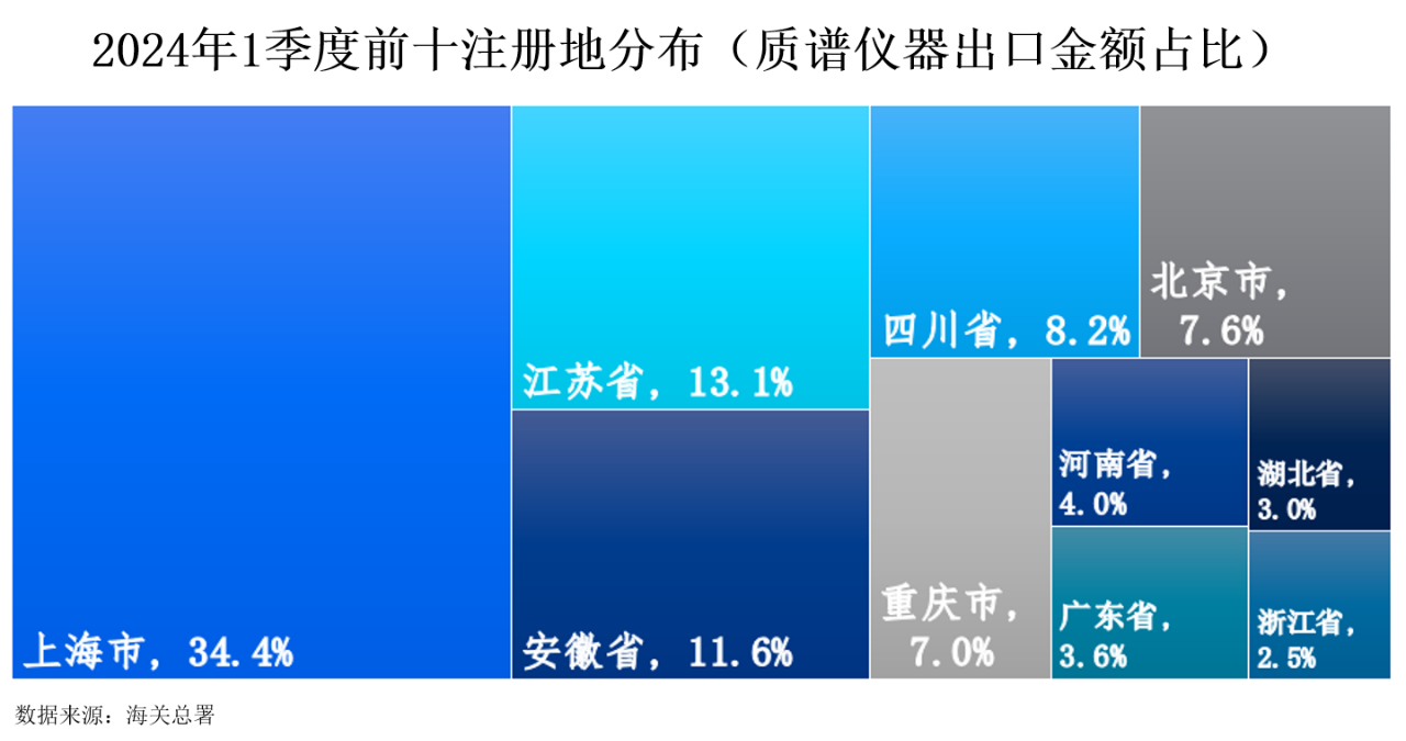 2024年1季度,中國(guó)質(zhì)譜儀器出口額最高的十個(gè)注冊(cè)地依次是上海市、江蘇省、安徽省、四川省、北京市、重慶市、河南省、湖北省、廣東省和浙江省。其中,上海市以34.4%的占比遙遙領(lǐng)先,江蘇省和安徽省分別以13.1%和11.6%的占比緊隨其后。四川省、北京市和重慶市的占比分別為8.2%、7.6%和7.0%。