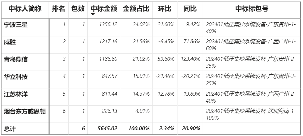 總金額5645.02萬元,6家企業實現中標,三星中標最大標包1356.12萬元;