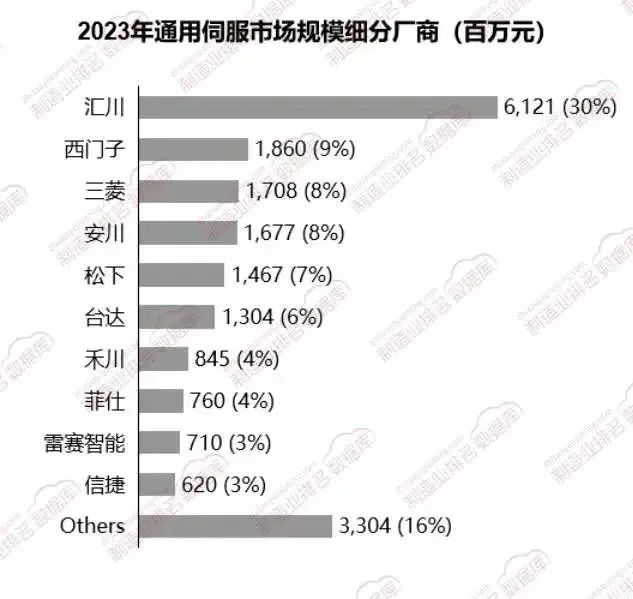 從2023年的銷售額數據來看,通用伺服市場呈現出較高的集中度,前五家廠商的市場份額超過60%。其中,匯川以30%的市場份額位居第一,領先于西門子、三菱等國際品牌。