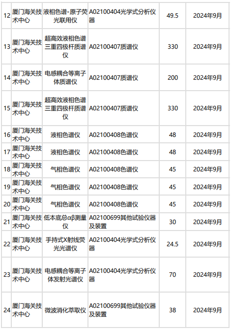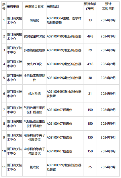 廈門海關(guān)技術(shù)中心本次共計(jì)預(yù)算2748萬,預(yù)采購實(shí)時(shí)定量PCR儀、多功能凝膠成像系統(tǒng)、氣相色譜三重四級(jí)桿質(zhì)譜儀、電感耦合等離子體質(zhì)譜儀等。
