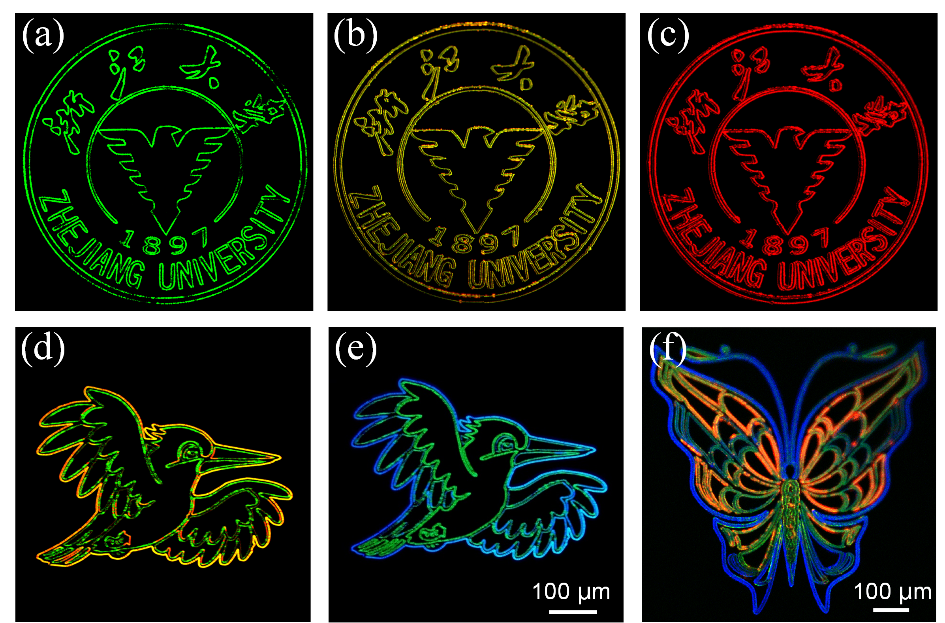 圖3(a)~(c)在玻璃內(nèi)部直寫不同顏色的浙江大學(xué)校徽,(d)~(f)納米晶彩色圖案直寫