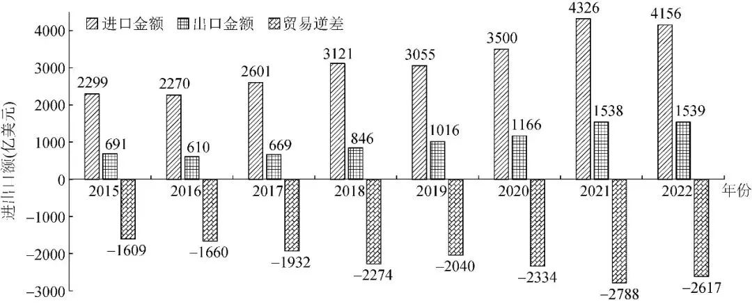 從價值量來看,2022年中國集成電路進口總額4156億美元,比上年下降3.9%;出口總額1539億美元,增長0.3%;貿易逆差2616億美元,下降6.1%(圖2)。對比來看,中國集成電路產品進出口的單品價值有較大增幅,尤其是出口在數量大幅下降的情況下金額卻有所增長,中國集成電路產業的發展質量在有序提升,體現了產業質量的提升。