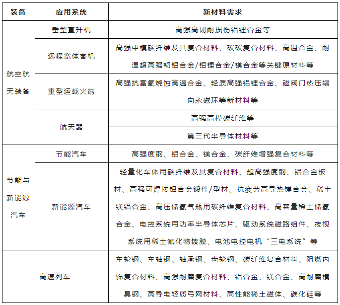 《中國制造2025》中提出大力發展新能源、高效能、高安全的系統技術與裝備,完善我國現代交通運載核心技術體系,發展時速400km高速列車、遠程寬體客機、新能源汽車等運載工具,提升交通運載可持續發展能力和走出去戰略支撐能力。因此,亟需對重型直升機、高速列車、遠程寬體客機、新能源汽車、重型運載火箭、航天器等運載工具所需核心部件及關鍵材料進行研發,形成核心部件產品自主保障能力(見表1)。