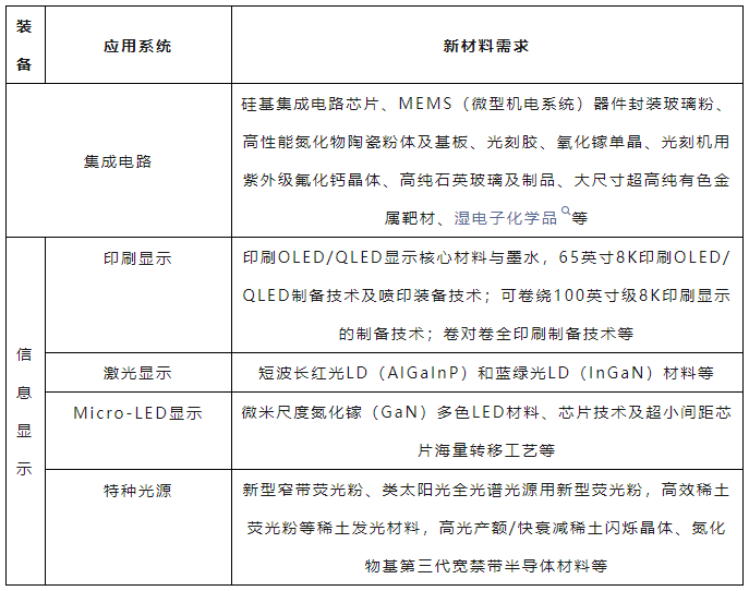 集成電路與信息顯示是我國電子信息產業的兩大基石,是信息領域為數不多的千億美元級產業,帶動力和輻射力極強,在我國國民經濟中占有極其重要的戰略地位,信息顯示領域新材料需求見表3。新型信息技術及產業的發展需要電子信息材料支撐,當前我國電子信息材料研發技術與發達國家存在較大差距。