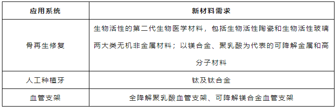 隨著全球人口老齡化日益加劇,人們對自身健康的關注度不斷提高,健康產業進入加速發展時期。生物醫用材料的快速突破,將在疾病快速診斷、人體器官修復移植方面為人類帶來福祉,對國家的醫療安全、人民健康產生至關重要的影響,生命健康領域新材料需求見表4