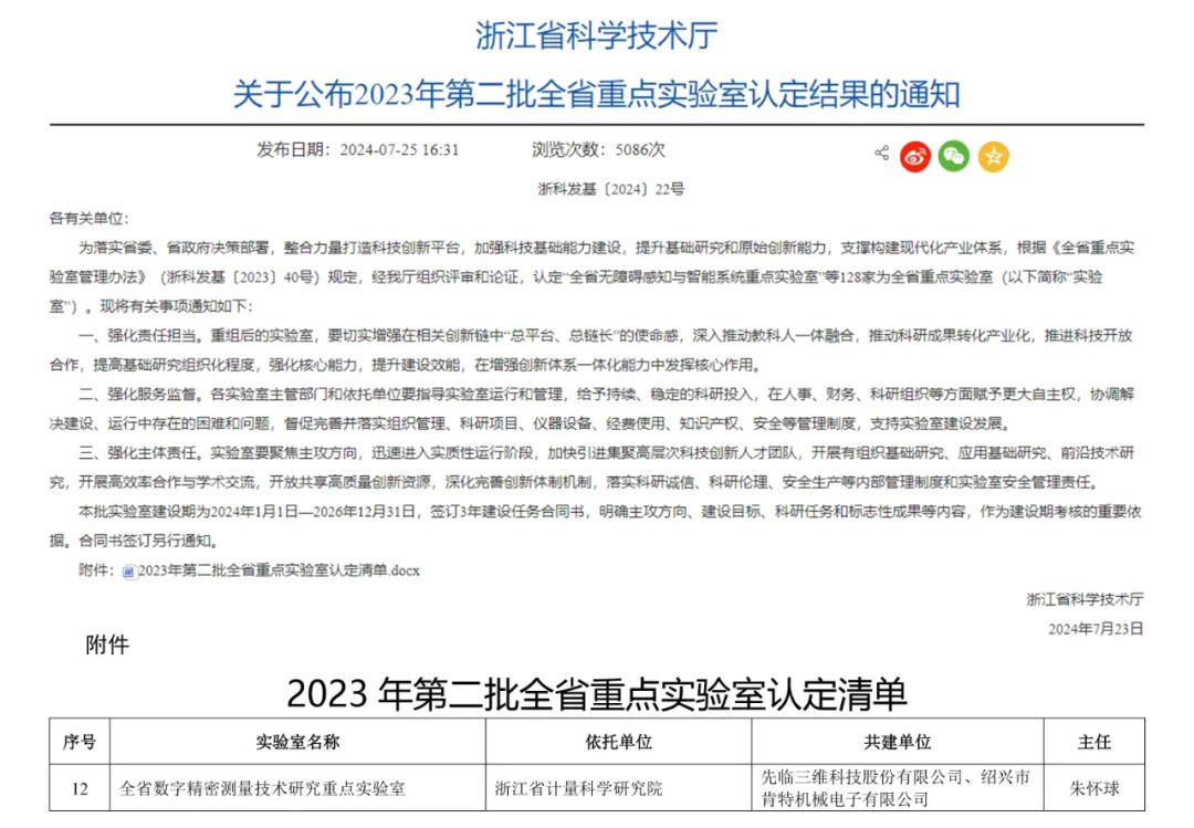 近日,由浙江省質量科學研究院牽頭,先臨三維科技股份有限公司參與共建的“全省數字精密測量技術研究重點實驗室”被浙江省科學技術廳認定為浙江省2023年第二批全省重點實驗室。