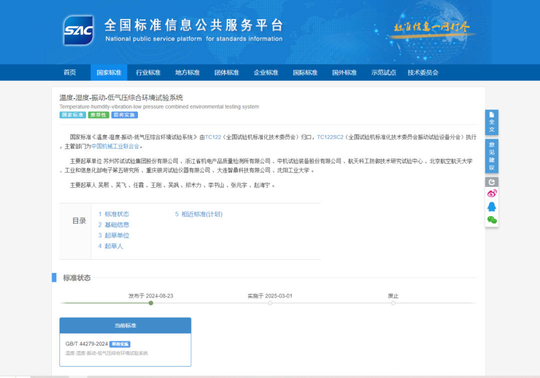 蘇試試驗作為工業產品環境適應性與質量可靠性試驗驗證及分析服務解決方案提供商,是相關國家標準、行業標準的主要起草者之一。在我國力學、氣候、綜合等試驗設備及試驗方法領域,集團已累計主持或參與制定國家標準53項,行業標準15項。