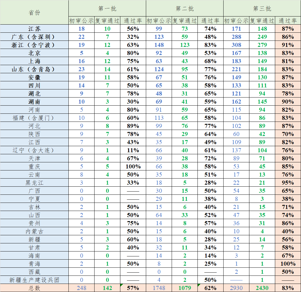 3.各省市前三批小巨人復(fù)審?fù)ㄟ^率一覽