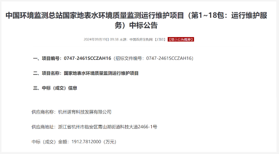 2024年9月19日,“中國環境監測總站國家地表水環境質量監測運行維護項目”發布中標公告,杭州譜育科技發展有限公司(以下簡稱“譜育科技”)成功中標包件4,中標金額1912.78萬元。本次中標包件含102個國控水站運行維護及201個國控斷面采測服務工作,服務范圍覆蓋云南省、四川省、西藏自治區。
