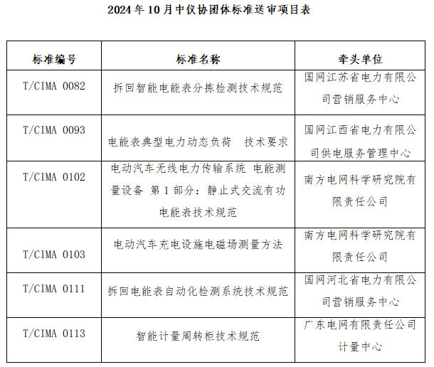 2024年10月 24-25日,中國儀器儀表行業(yè)協(xié)會(以下簡稱“協(xié)會”) 以視頻會議形式組織召開了《電能表典型電力動態(tài)負(fù)荷 技術(shù)要求》等6項團(tuán)體標(biāo)準(zhǔn)(項目信息詳見附表)送審稿審查會。來自國網(wǎng)山東省電力公司電力科學(xué)研究院、廣東電網(wǎng)有限責(zé)任公司計量中心、中國電力科學(xué)研究院計量研究所、國網(wǎng)浙江省電力有限公司營銷服務(wù)中心、廣西電網(wǎng)計量中心、中國電力科學(xué)研究院有限公司、國網(wǎng)河南省電力公司營銷服務(wù)中心、國網(wǎng)山東省電力公司、黑龍江省電工儀器儀表工程技術(shù)研究中心有限公司的九位專家組成審查組,國網(wǎng)山東省電力公司電力科學(xué)研究院的徐民教授級高工擔(dān)任組長。會議由協(xié)會副秘書長程紅主持。協(xié)會及電工儀表分會的團(tuán)體標(biāo)準(zhǔn)工作人員、標(biāo)準(zhǔn)主要起草人參加了本次會議。