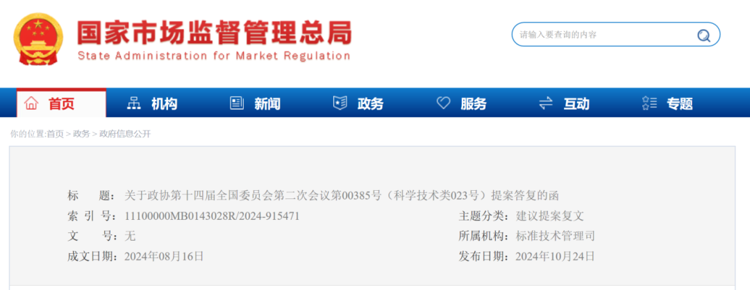 日前,市場監(jiān)管總局在《關于政協(xié)第十四屆全國委員會第二次會議第00385號(科學技術類023號)提案答復的函》中表示,市場監(jiān)管總局(國家標準委)高度重視標準化支撐高質量發(fā)展的基礎性引領性作用,正加快推動相關工作。具體內容如下:
