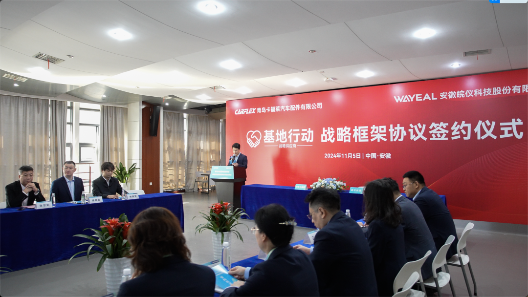 11月5日上午,安徽皖儀科技股份有限公司(以下簡稱“皖儀科技”)與青島卡福萊汽車配件有限公司(以下簡稱“青島卡福萊”)在皖儀科技總部正式簽署基地行動戰略框架協議。雙方圍繞汽車配件行業所面臨的新領域、新機遇展開深入交流,共同探索汽車配件行業發展新篇章。