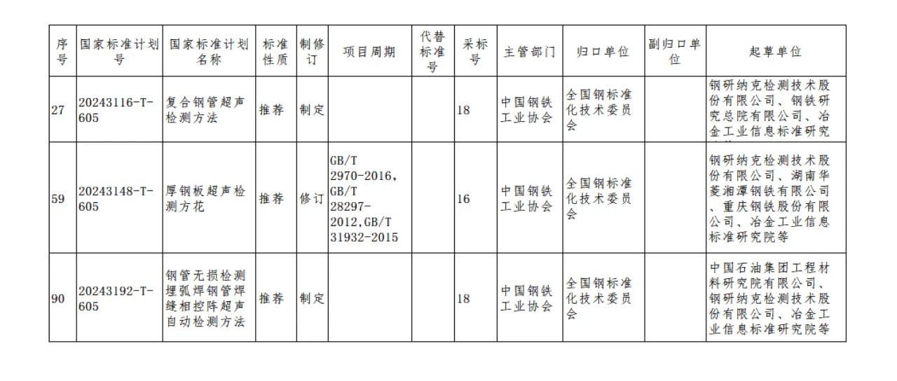 國家標準化管理委員會通知本次獲批推薦性國家標準計劃共計220項,鋼研納克無損檢測專業(yè)牽頭起草標準2項,參研1項(其中2項標準制定、1項標準修訂),見下表: