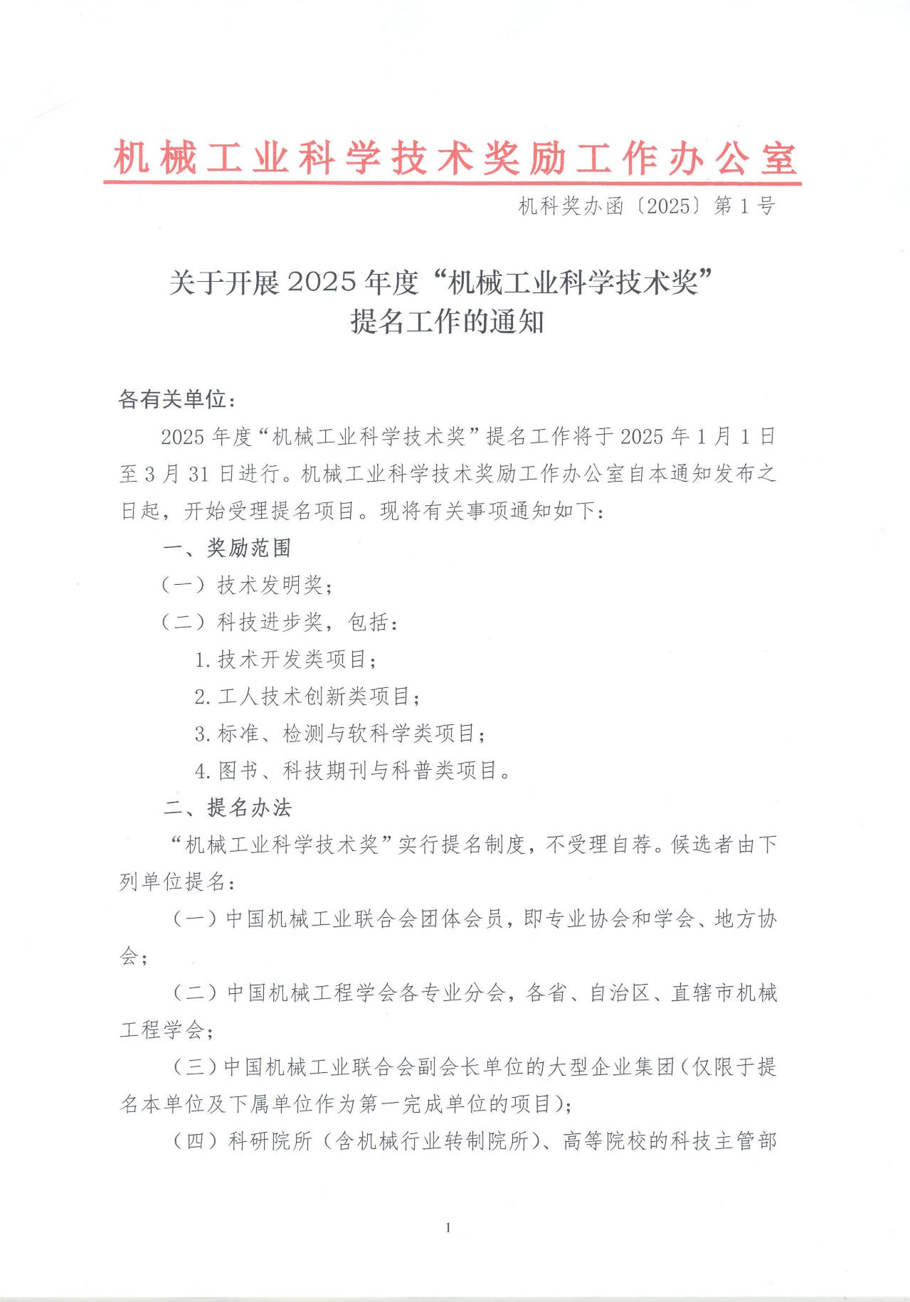 2025年度“機(jī)械工業(yè)科學(xué)技術(shù)獎(jiǎng)”提名工作將于2025年1月1日至3月31日進(jìn)行。機(jī)械工業(yè)科學(xué)技術(shù)獎(jiǎng)勵(lì)工作辦公室自本通知發(fā)布之日起,開始受理提名項(xiàng)目。現(xiàn)將有關(guān)事項(xiàng)通知如下:(詳見(jiàn)通知正文)