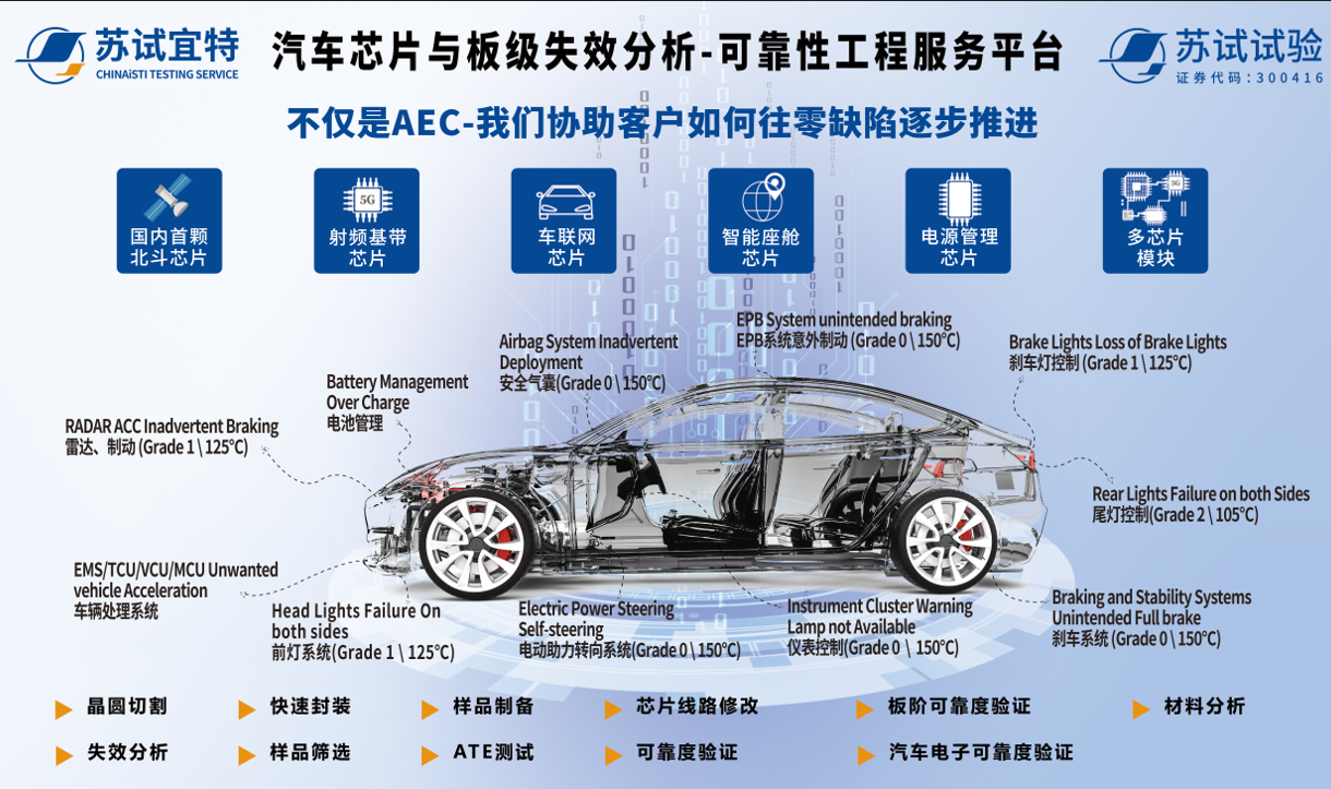 AEC-Q100是由美國汽車電子協會(AEC)制定,既是車規芯片進入汽車市場的基本要求,也是集成電路廠家進入汽車領域的通行證之一。作為集成電路與汽車零部件一站式整合驗證服務平臺,蘇試宜特現已具備AEC-Q100、AEC-Q101、AEC-Q102、AEC-Q103、AEC-Q104、AEC-Q200、AEC-Q007的測試能力。截止目前,已助力超300個車規級芯片的可靠性驗證全套方案的制定與執行。如您欲了解更多信息可通過以下方式聯系我們。