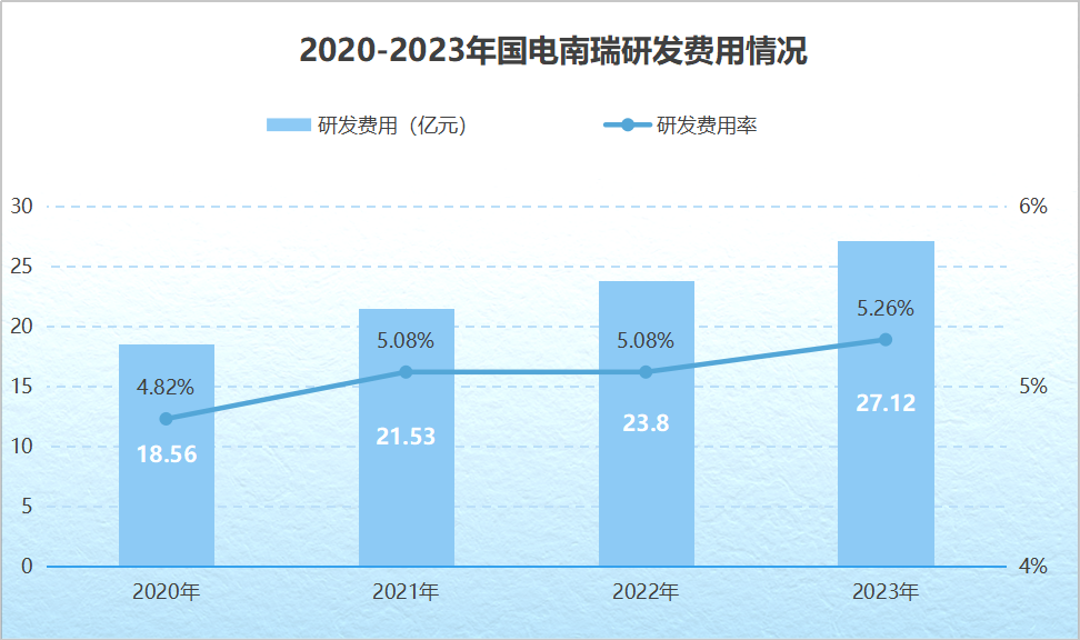 公司較強的技術實力離不開持續的研發投入。2020到2023年,國電南瑞研發費用率從4.82%提高到5.26%,超過了平高電氣等公司。