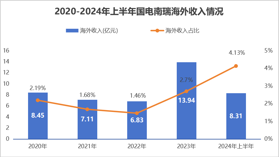 2020到2023年,國電南瑞海外收入從8.45億穩步攀升至13.94億,海外收入占比也從2.19%逐步提高到2.7%,增長勢頭強勁。2024年上半年,這一增長趨勢得以延續,公司海外收入占比進一步躍升至4.13%。