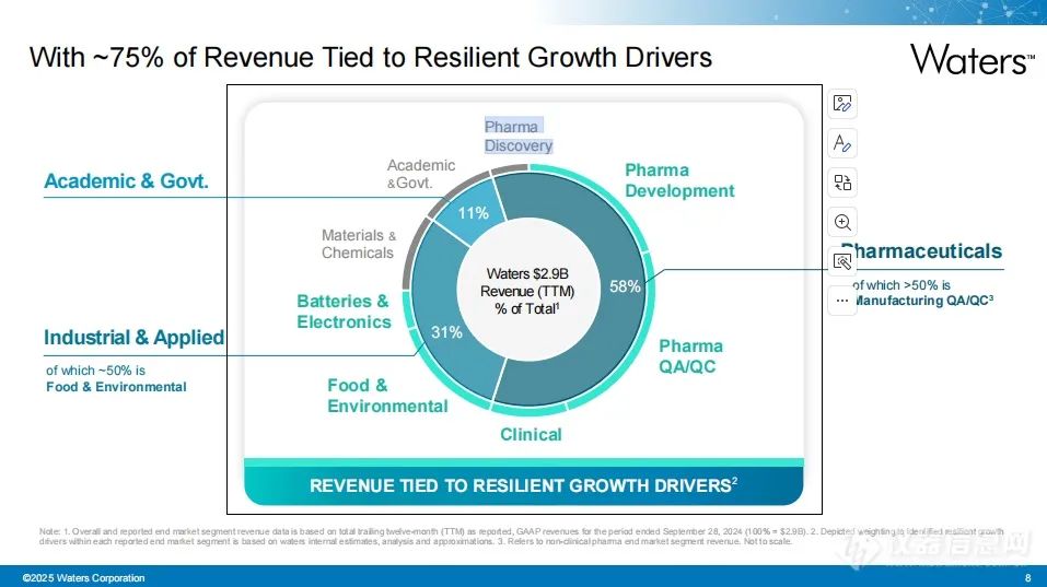 Batra指出,Waters專注于監(jiān)管嚴格且需求尚未被充分滿足的市場,市場總體規(guī)模約為120億美元,并以中個位數(shù)的速度穩(wěn)定增長。在生命科學領域,制藥行業(yè)的長期增速約為高個位數(shù),主要得益于新型治療方法和生物制劑的推動;而臨床領域同樣以高個位數(shù)增長,重點聚焦特定臨床細分市場,尤其是質譜技術在早期疾病檢測和小分子分析中的應用。此外,在工業(yè)與應用領域(包括食品和環(huán)境市場),增長率約為中個位數(shù),受全球人口增長以及對安全食品和清潔水源需求的推動;同時,PFAS(全氟和多氟化合物)檢測需求及減少食品和環(huán)境中雜質的趨勢也帶來了新的增長機遇。材料領域的增速為中個位數(shù),近期受經(jīng)濟電氣化進程加速的推動,尤其是電動車需求的增加表現(xiàn)出更強勁的增長。而學術與政府領域作為最小的終端市場,其長期增速為低個位數(shù),主要依賴政府撥款支持。