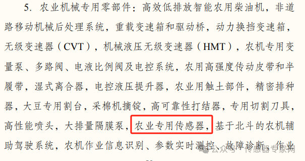 《目錄》儀器儀表領域中,基礎零部件和元器件共計37種,其中傳感器20種,有4種農業傳感器被“點名”列入,分別是:播種作業資料傳感器、收獲作業資料傳感器、植物信息傳感器、土壤信息傳感器。
