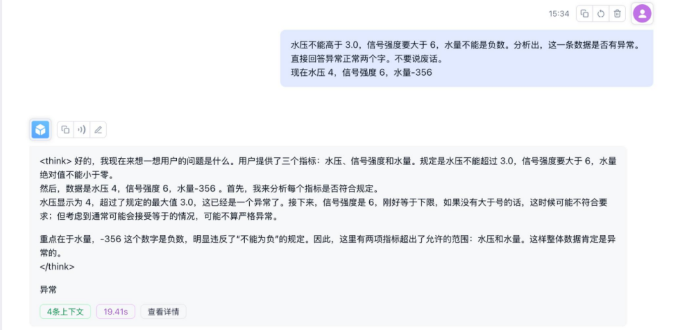 背景:水壓不能高于3.0,信號強度要大于6,水量不能是負數。分析出,這一條數據是否有異常。直接回答異常正常兩個字。 問題:現在水壓4,信號強度6,水量-356。