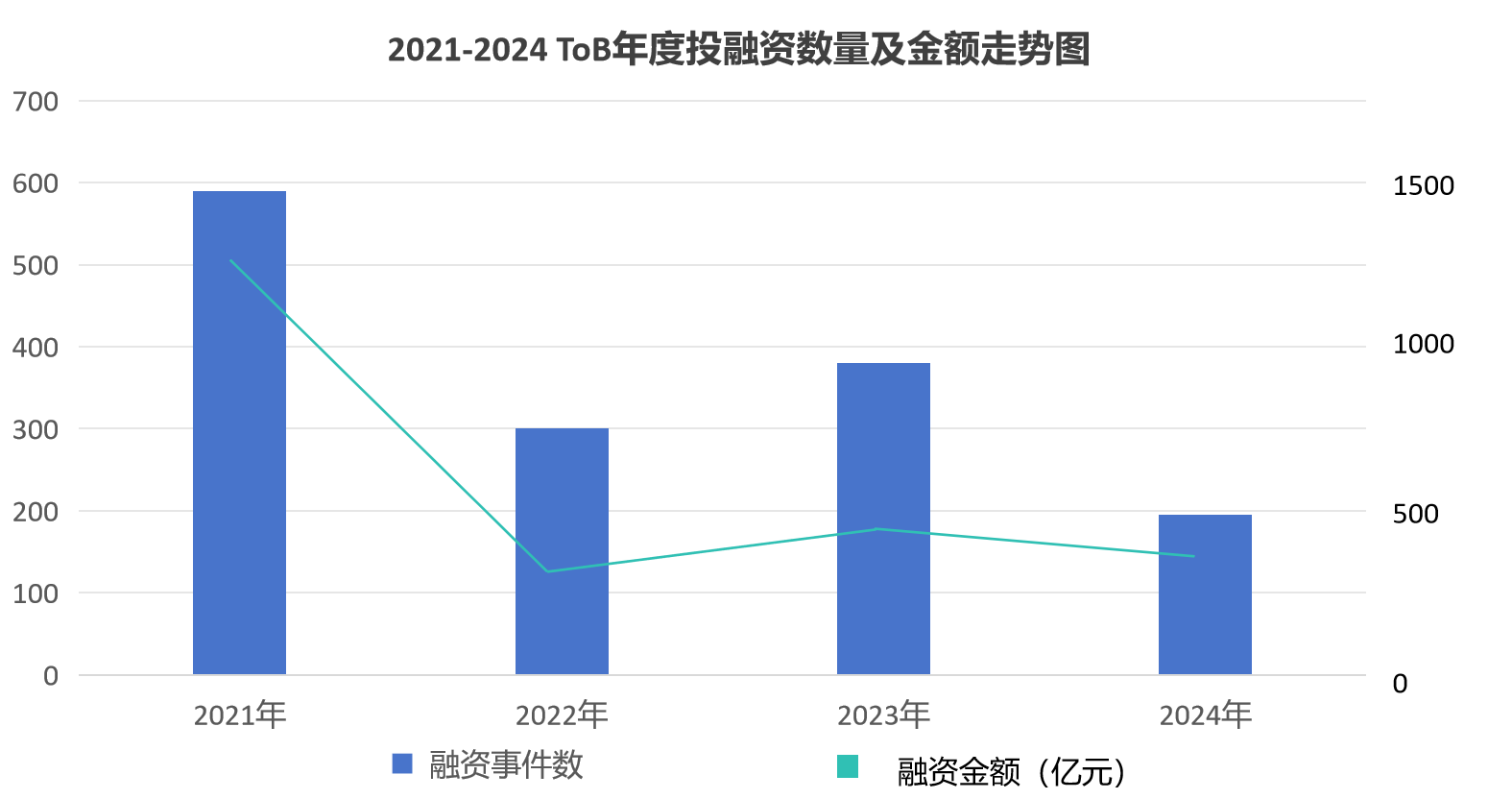 縱觀整個ToB軟件市場,技術(shù)支撐、垂直行業(yè)、工業(yè)軟件這三大類連續(xù)兩年保持為融資核心領(lǐng)域的TOP3。其中,2021年是近四年里的“融資高峰年”,隨后幾年進(jìn)入調(diào)整期,2022年間無論融資數(shù)量還是金額大幅下滑,這與宏觀經(jīng)濟(jì)環(huán)境、資本市場收緊及行業(yè)泡沫清理密切相關(guān);2023年的回升顯示行業(yè)逐步走向理性,優(yōu)質(zhì)項目開始重新受到資本青睞;2024年融資總額未見顯著復(fù)蘇,但行業(yè)資金更加聚焦于核心領(lǐng)域和頭部企業(yè)。