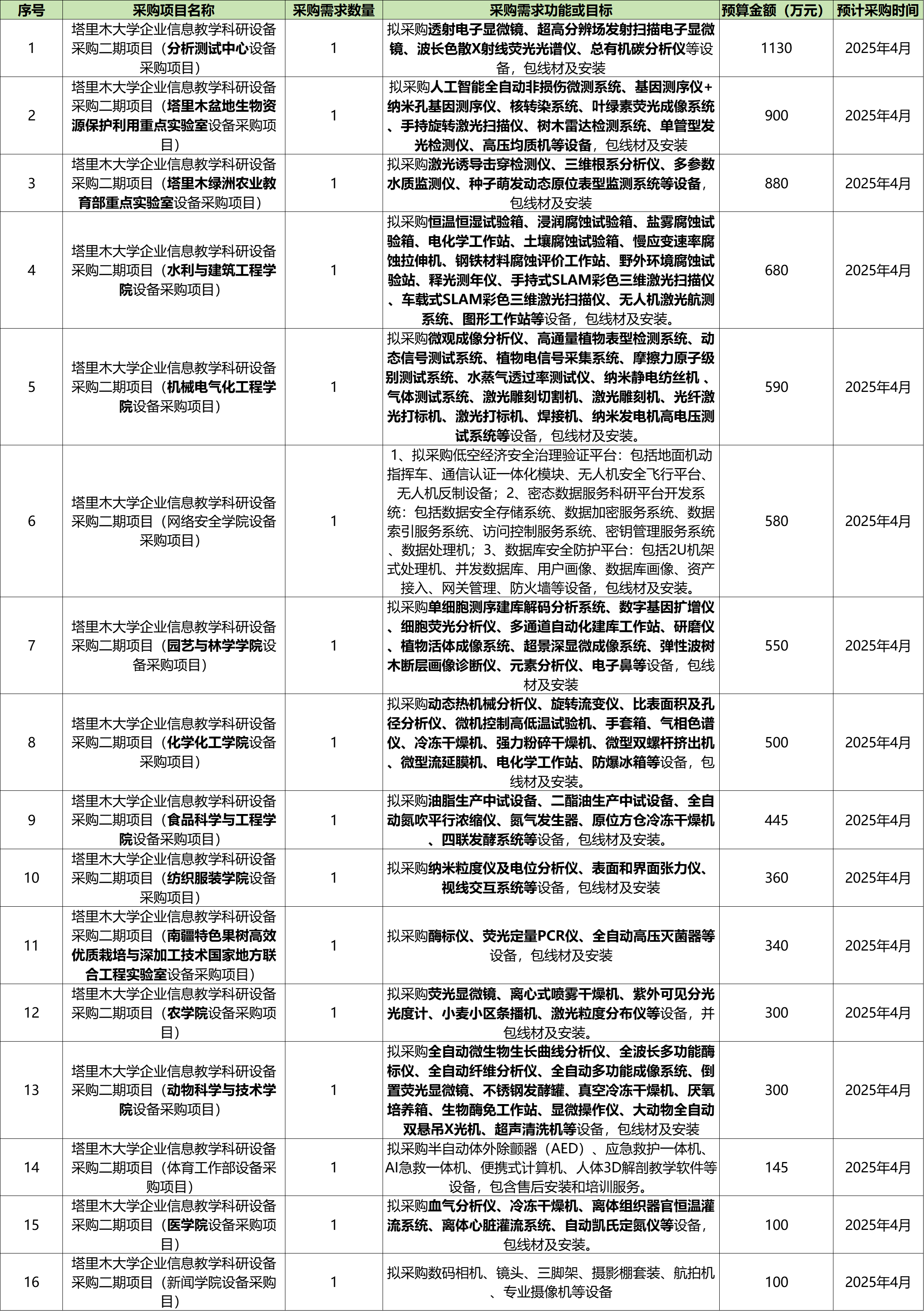 為便于供應商及時了解政府采購信息,根據《財政部關于開展政府采購意向公開工作的通知》(財庫〔202010號)等有關規定,現將塔里木大學20253月第三批采購意向公開如下: