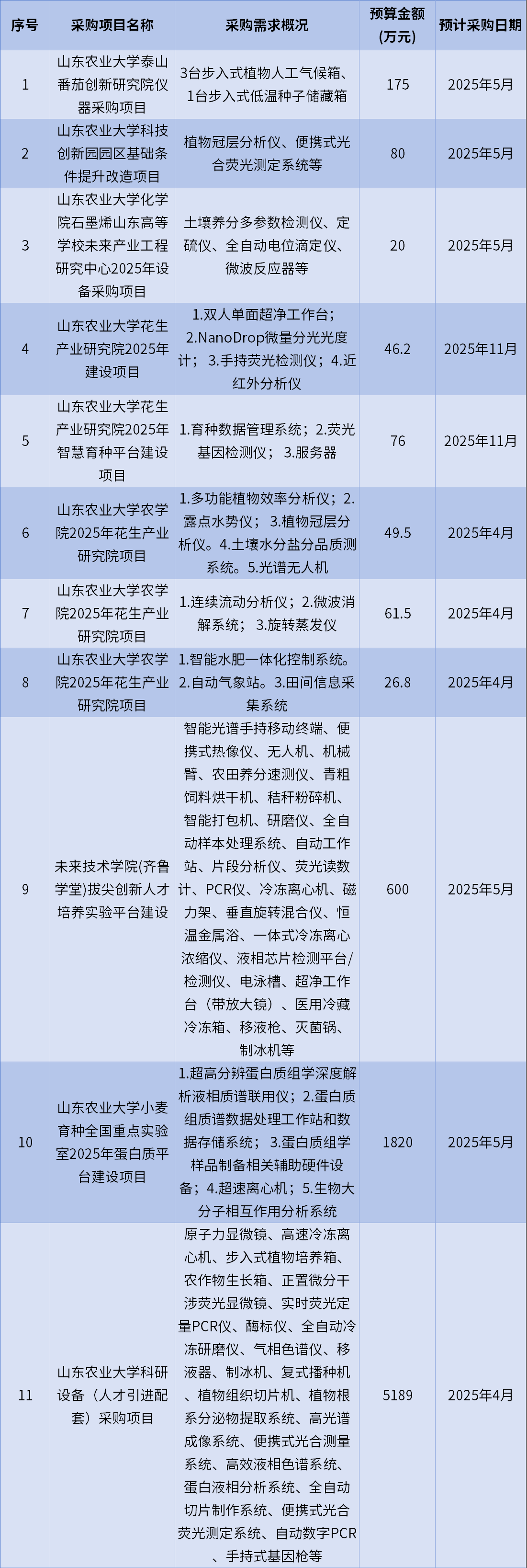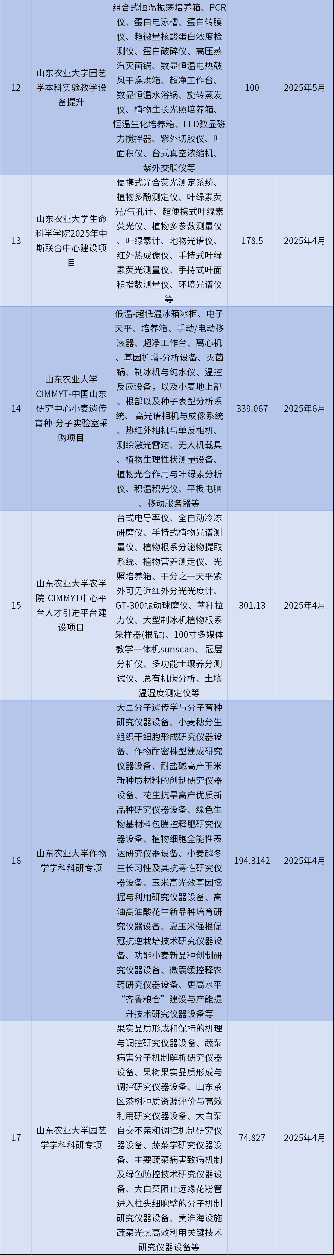 山東農(nóng)業(yè)大學(xué)儀器采購意向匯總,本次匯總含17項采購專項,預(yù)計采購時間在2025年4月、5月、11月,預(yù)算金額共計9331.8382萬元。