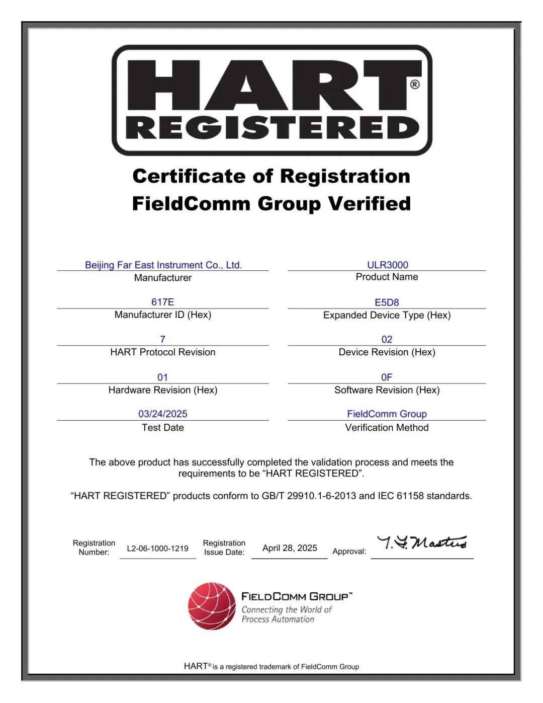 近日,遠(yuǎn)東儀表公司自主研發(fā)的ULR3000連續(xù)調(diào)頻雷達(dá)物位計(jì)正式通過國(guó)際權(quán)威機(jī)構(gòu) Field Comm Group的HART® 7通信協(xié)議認(rèn)證(注冊(cè)號(hào):L2-06-1000-1219),并嚴(yán)格符合 GB/T 29910.1-6-2013和IEC 61158國(guó)際標(biāo)準(zhǔn),標(biāo)志著該產(chǎn)品在技術(shù)性能、通信兼容性及標(biāo)準(zhǔn)化水平上達(dá)到國(guó)際領(lǐng)先水準(zhǔn)。