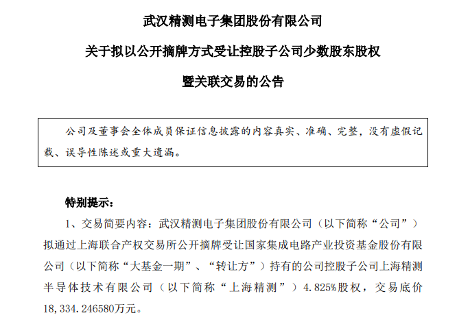 5月31日,精測電子(300567)公告,公司擬通過上海聯(lián)合產(chǎn)權(quán)交易所公開摘牌受讓國家集成電路產(chǎn)業(yè)投資基金股份有限公司(簡稱“大基金一期”)持有的公司控股子公司上海精測半導(dǎo)體技術(shù)有限公司(簡稱“上海精測”)4.825%股權(quán),交易底價18,334.246580萬元。本次交易構(gòu)成關(guān)聯(lián)交易,未構(gòu)成重大資產(chǎn)重組,本次交易尚需公司股東大會審批通過。