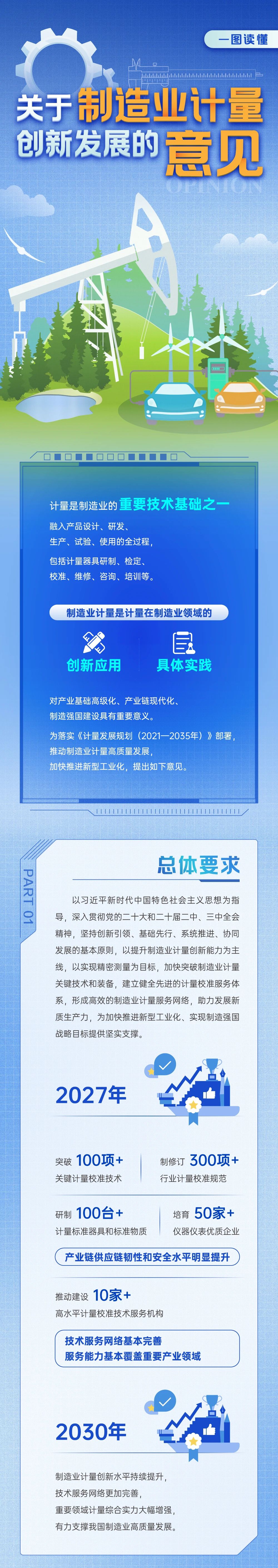 《意見》是制造業(yè)計量領(lǐng)域首個政策性文件,堅持創(chuàng)新引領(lǐng)、基礎(chǔ)先行、系統(tǒng)推進(jìn)、協(xié)同發(fā)展的基本原則,以提升制造業(yè)計量創(chuàng)新能力為主線,以實現(xiàn)精密測量為目標(biāo),結(jié)合當(dāng)前產(chǎn)業(yè)現(xiàn)狀和制造業(yè)高質(zhì)量發(fā)展要求,提出到2027年,制造業(yè)計量發(fā)展取得積極進(jìn)展,突破100項以上關(guān)鍵計量校準(zhǔn)技術(shù),制修訂300項以上行業(yè)計量校準(zhǔn)規(guī)范,研制100臺套以上計量器具和標(biāo)準(zhǔn)物質(zhì),產(chǎn)業(yè)鏈供應(yīng)鏈韌性和安全水平明顯提升,培育50家以上儀器儀表優(yōu)質(zhì)企業(yè),推動建設(shè)10家以上制造業(yè)高水平計量校準(zhǔn)技術(shù)服務(wù)機(jī)構(gòu),技術(shù)服務(wù)網(wǎng)絡(luò)基本完善,服務(wù)能力基本覆蓋重要產(chǎn)業(yè)領(lǐng)域。到2030年,制造業(yè)計量創(chuàng)新水平持續(xù)提升,技術(shù)服務(wù)網(wǎng)絡(luò)更加完善,重要領(lǐng)域計量綜合實力大幅增強(qiáng),有力支撐我國制造業(yè)高質(zhì)量發(fā)展。