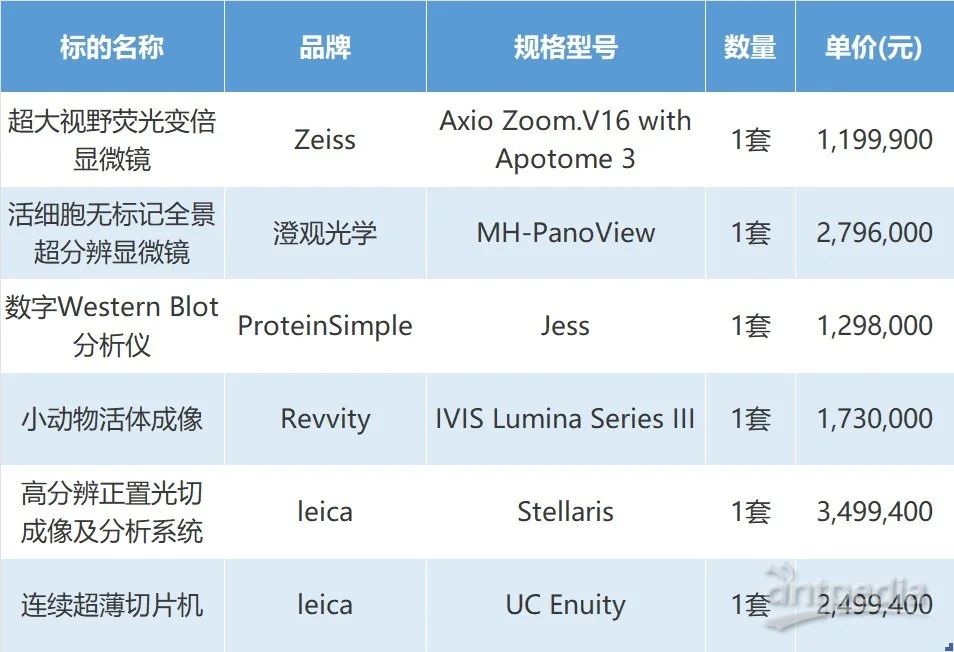 近日,中國科學(xué)院基礎(chǔ)醫(yī)學(xué)與腫瘤研究所(籌)(簡(jiǎn)稱“中科院醫(yī)學(xué)所”)一批尖端科研設(shè)備成功中標(biāo),總中標(biāo)金額達(dá)1302.27萬元。此次中標(biāo)設(shè)備涵蓋超大視野熒光變倍顯微鏡、活細(xì)胞無標(biāo)記全景超分辨顯微鏡、數(shù)字 Western Blot 分析儀、小動(dòng)物活體成像等,品牌包括蔡司、澄觀光學(xué)、ProteinSimple、瑞孚迪和徠卡。這批設(shè)備的引入,將為研究所的研究注入強(qiáng)大動(dòng)力。