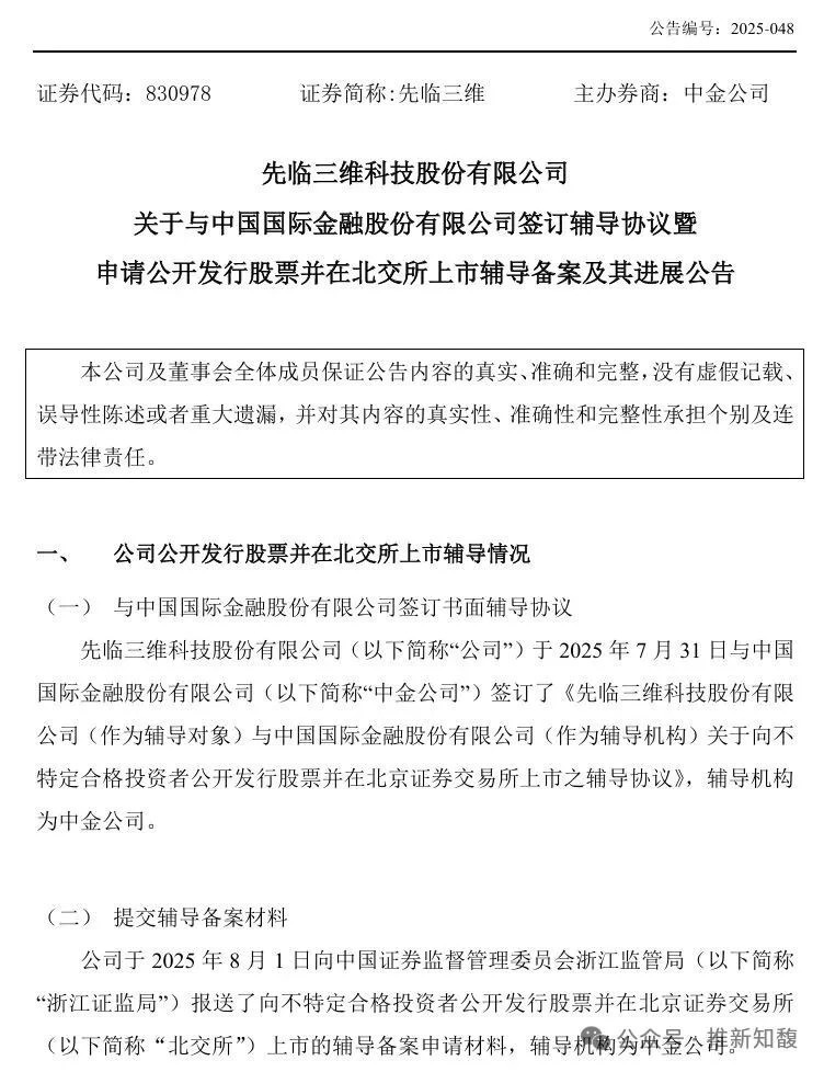 2025年7月31日,先臨三維與中國國際金融股份有限公司(“中金公司”)簽訂輔導協(xié)議,正式啟動IPO進程。