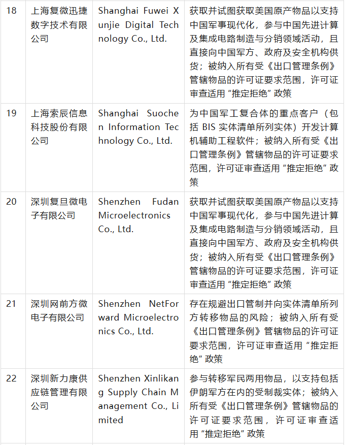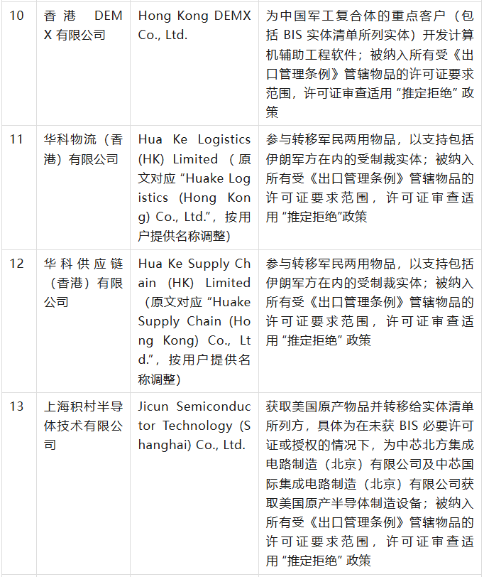 美國商務(wù)部工業(yè)與安全局(BIS)于9月12日在美國聯(lián)邦公報(bào)發(fā)布公告,通過修訂《出口管理?xiàng)l例》(EAR),將 32 家實(shí)體新增至實(shí)體清單,其中有23家是中國公司,具體清單、列入實(shí)體清單的理由及管制措施如下表(表中提及的列入實(shí)體清單的理由為BIS方面指認(rèn),不代表本號對該理由或相關(guān)事實(shí)的認(rèn)可):