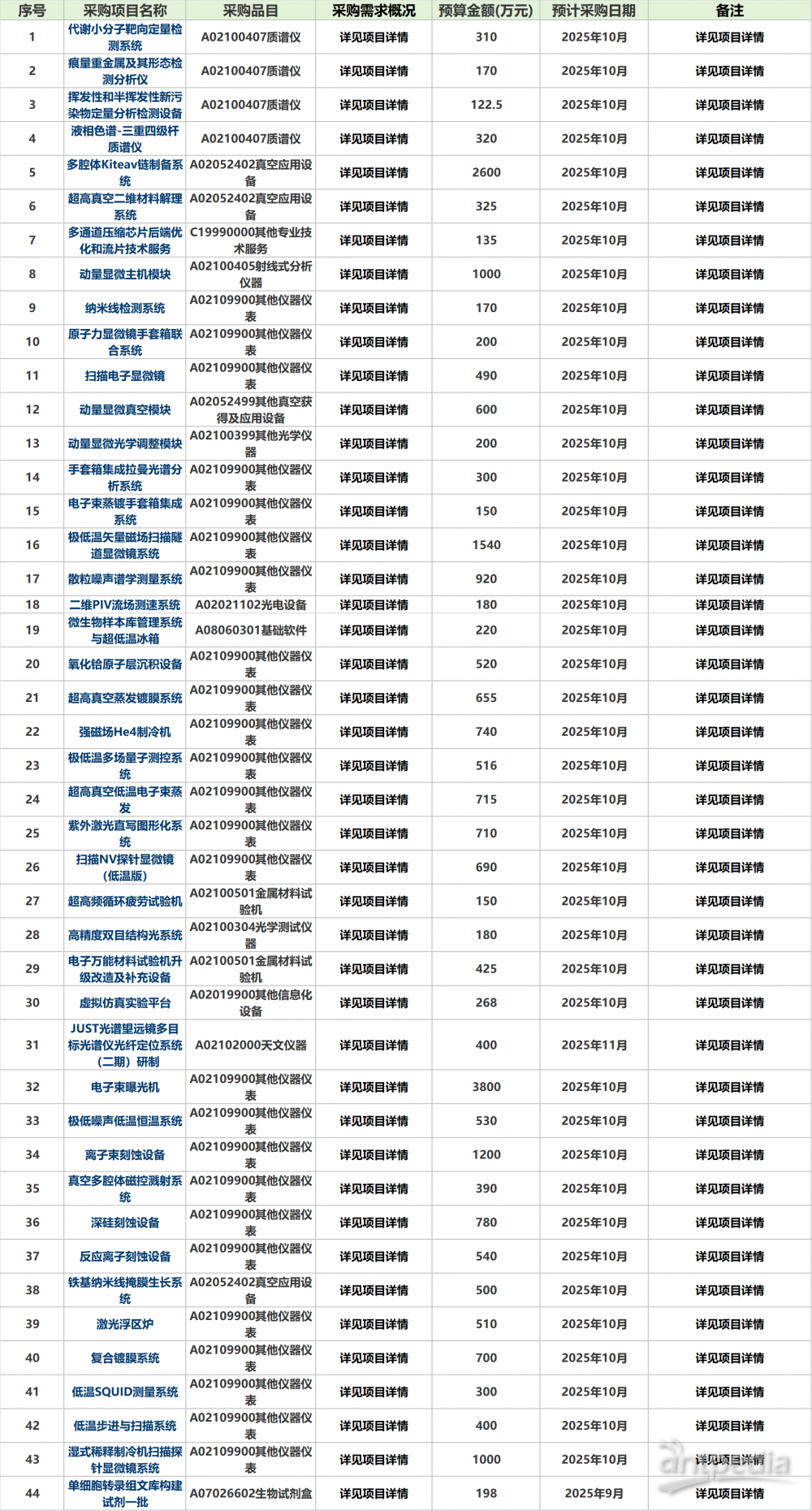 中國政府采購網消息,近日,上海交通大學連續發布2025年度9月、10月及11月政府采購意向。內容顯示,該批次采購意向采購標的涵蓋多類科研儀器設備及專業技術服務,包括代謝小分子靶向定量檢測系統、液相色譜  -三重四級桿質譜儀、極低溫矢量磁場掃描隧道顯微鏡系統等。公開信息顯示,該批次采購預算總金額達到2.67億元,采購日期方面,除“單細胞轉錄組文庫構建試劑一批”及“JUST光譜望遠鏡多目標光譜儀光纖定位系統(二期)研制”將于9月和11月采購之外,其余項目均將于10月份進行采購。具體信息已項目相關采購公告和采購文件為準。