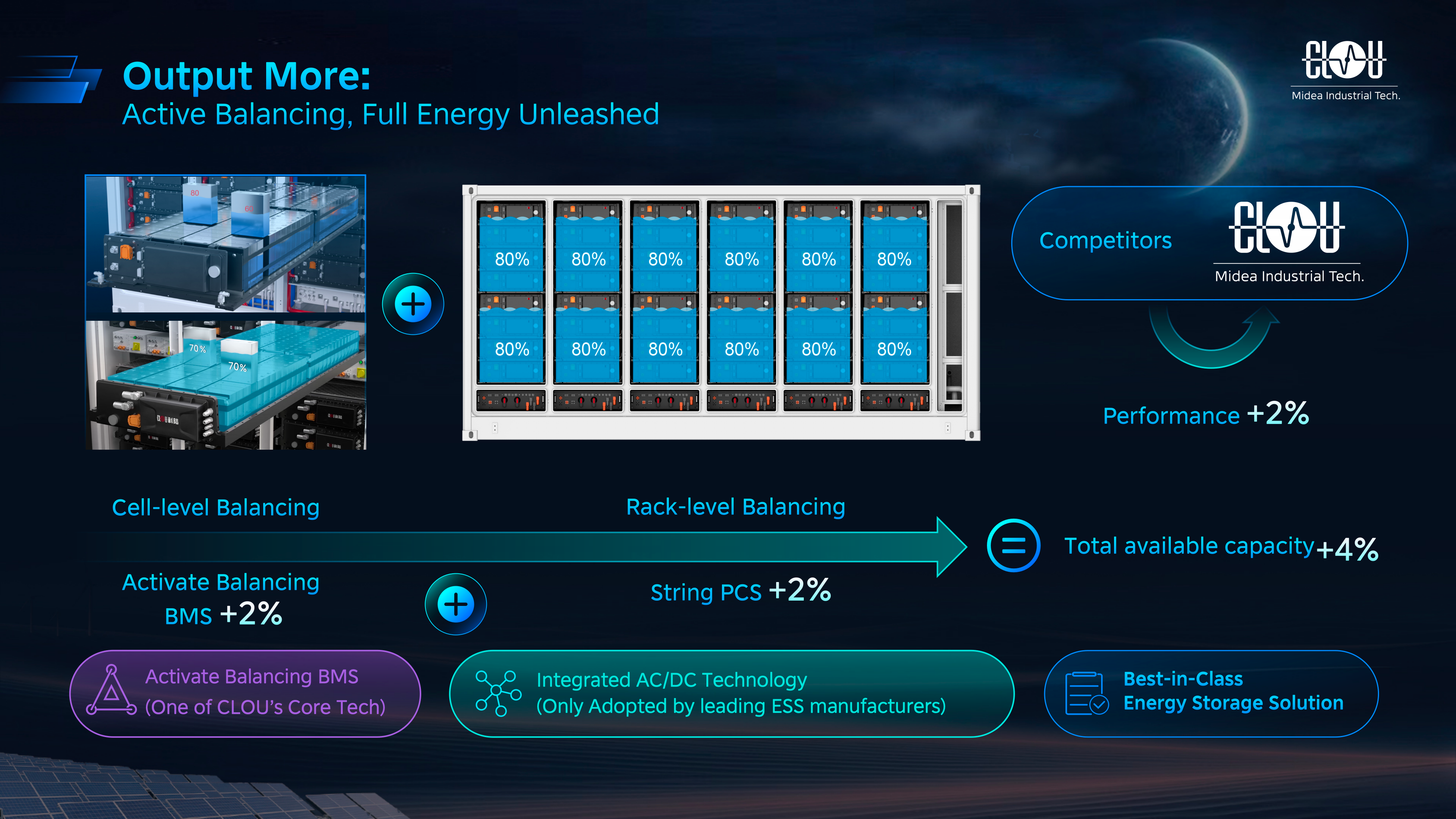 為優(yōu)化投資、降低施工成本,Aqua-C2.5S mini 支持 DC+AC 廠內(nèi)預(yù)組裝,設(shè)備現(xiàn)場(chǎng)安裝調(diào)試僅需3天,時(shí)間縮短50%;直流電纜不出倉(cāng)設(shè)計(jì)進(jìn)一步降低現(xiàn)場(chǎng)施工安全風(fēng)險(xiǎn)。主動(dòng)均衡 BMS 技術(shù)可解決被動(dòng)均衡長(zhǎng)時(shí)間運(yùn)行導(dǎo)致的電池包內(nèi)部電芯不一致問(wèn)題,避免系統(tǒng)停機(jī)人工均衡補(bǔ)電,大幅節(jié)省維護(hù)成本、提升運(yùn)營(yíng)效率。
