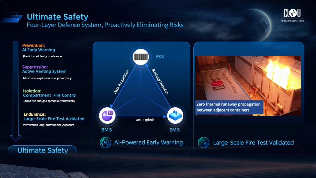 面對(duì)日本地震多發(fā)的地質(zhì)特點(diǎn),Aqua-C2.5系列滿足IEEE 693高抗震標(biāo)準(zhǔn),可輕松應(yīng)對(duì)當(dāng)?shù)乜拐鸺斑\(yùn)輸要求。系統(tǒng)還通過(guò)電芯故障告警、主動(dòng)通風(fēng)泄爆系統(tǒng)降低燃爆風(fēng)險(xiǎn)、獨(dú)立分倉(cāng)滅火,以及長(zhǎng)時(shí)耐火3小時(shí)以上設(shè)計(jì)構(gòu)建四級(jí)安全防御體系,保障系統(tǒng)極致安全。