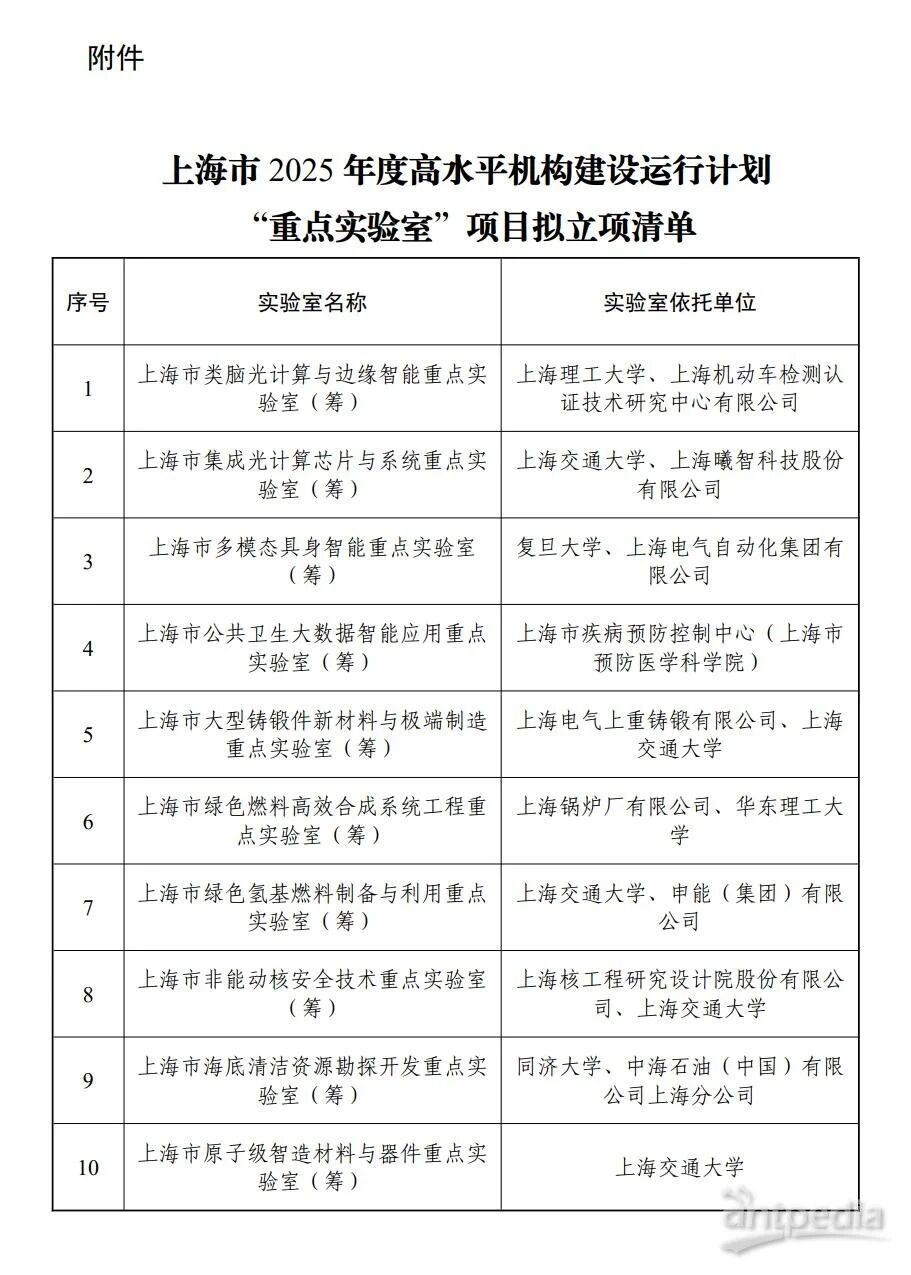 12月15日,上海市科技委員會網站公示上海市2025年度高水平機構建設運行計劃“重點實驗室”擬立項項目,共10項入選。