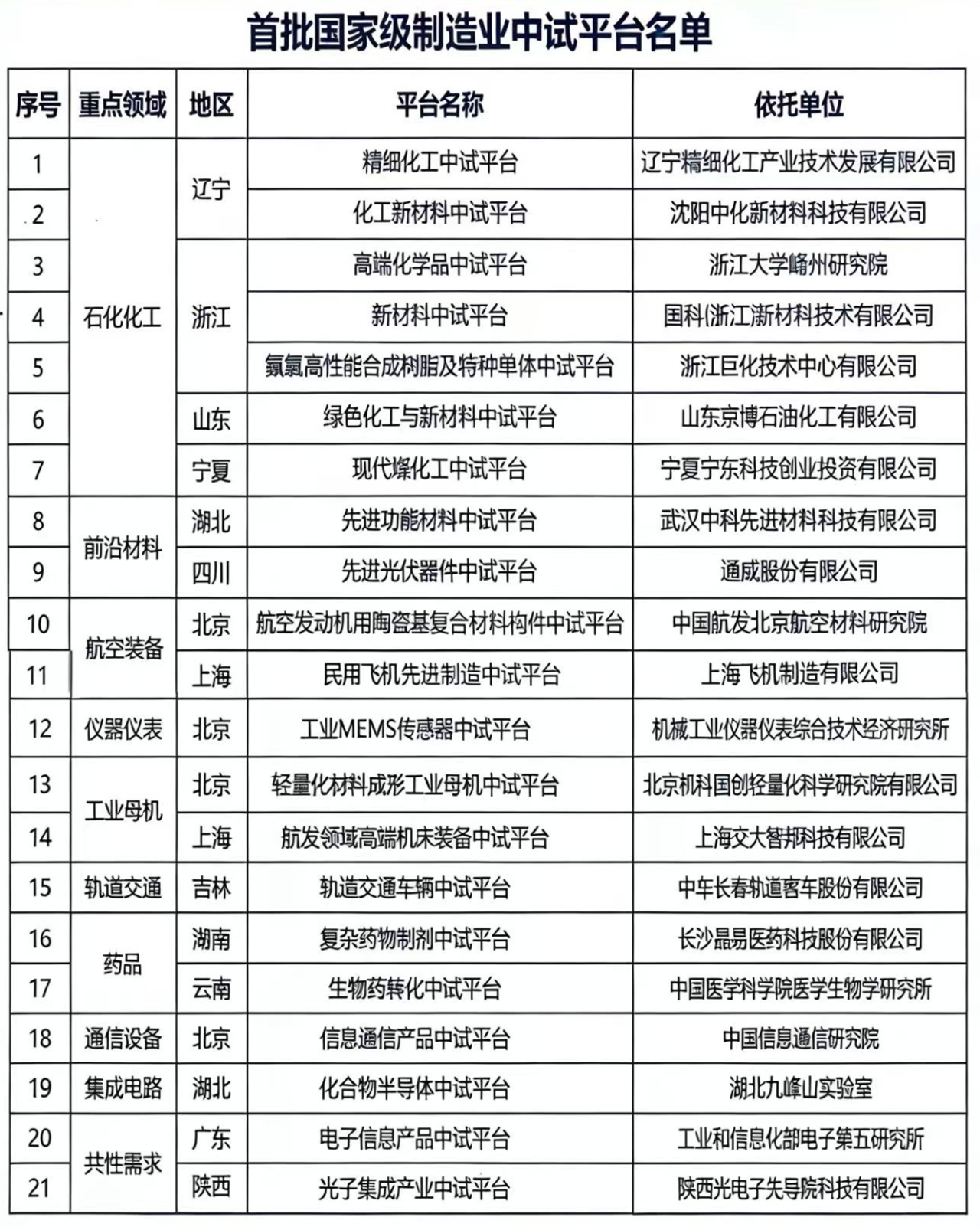 近日,工業(yè)和信息化部在遼寧省盤錦市召開制造業(yè)中試創(chuàng)新發(fā)展座談會(huì)。會(huì)上發(fā)布了首批國家級(jí)制造業(yè)中試平臺(tái)名單,全國共有21家平臺(tái)入選,分布在石化化工、集成電路、前沿材料、儀器儀表、工業(yè)母機(jī)等多個(gè)領(lǐng)域。
